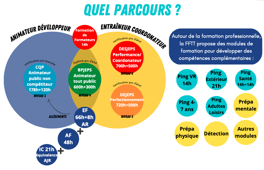 Il existe, à l’heure actuelle, quatre diplômes professionnels pour travailler dans le tennis de table (CQP, BPJEPS, DEJEPS, DESJEPS)